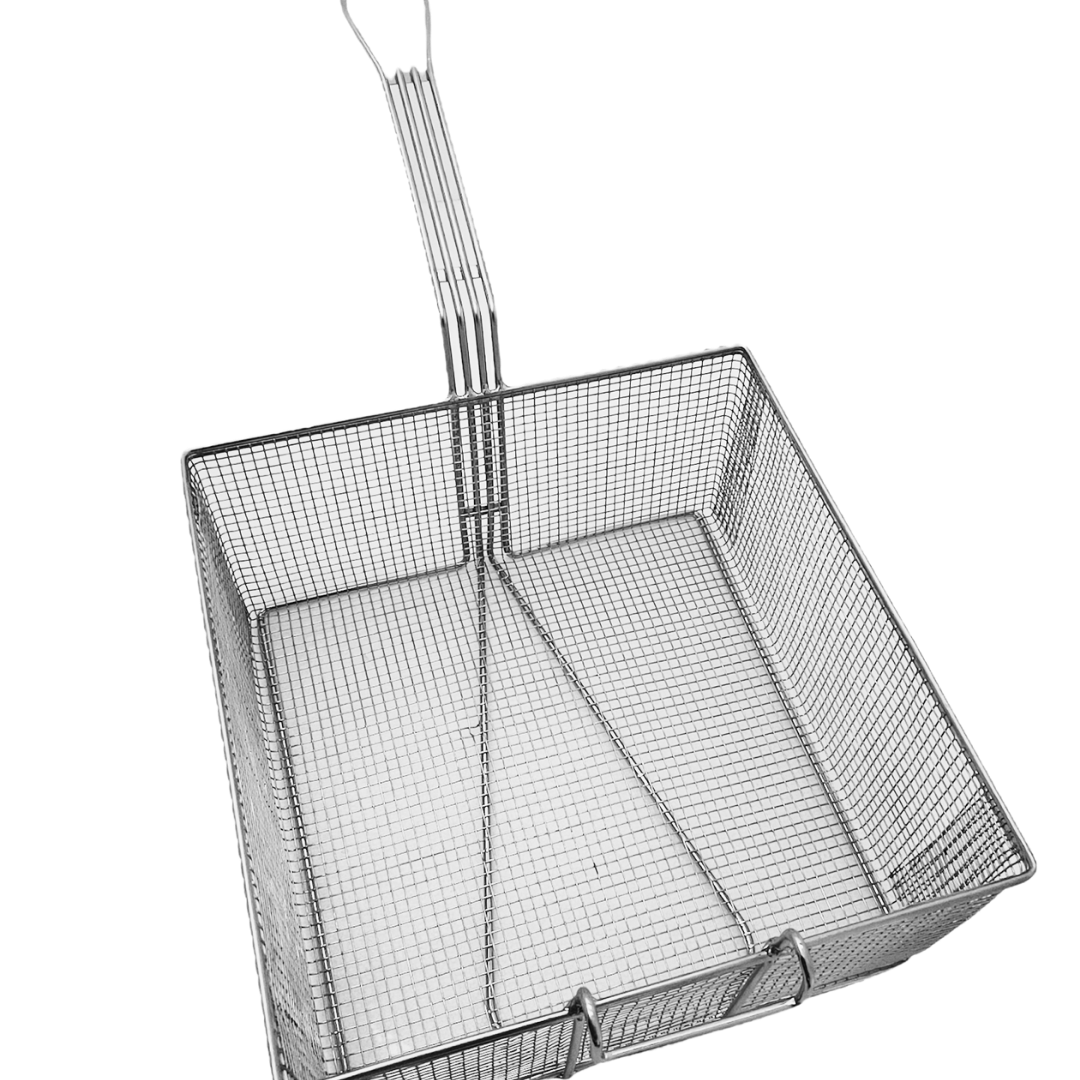 Tags: commercial fry basket, deep fry basket, heavy-duty fryer accessory, large fryer basket, square fryer basket, stainless steel frying basket
